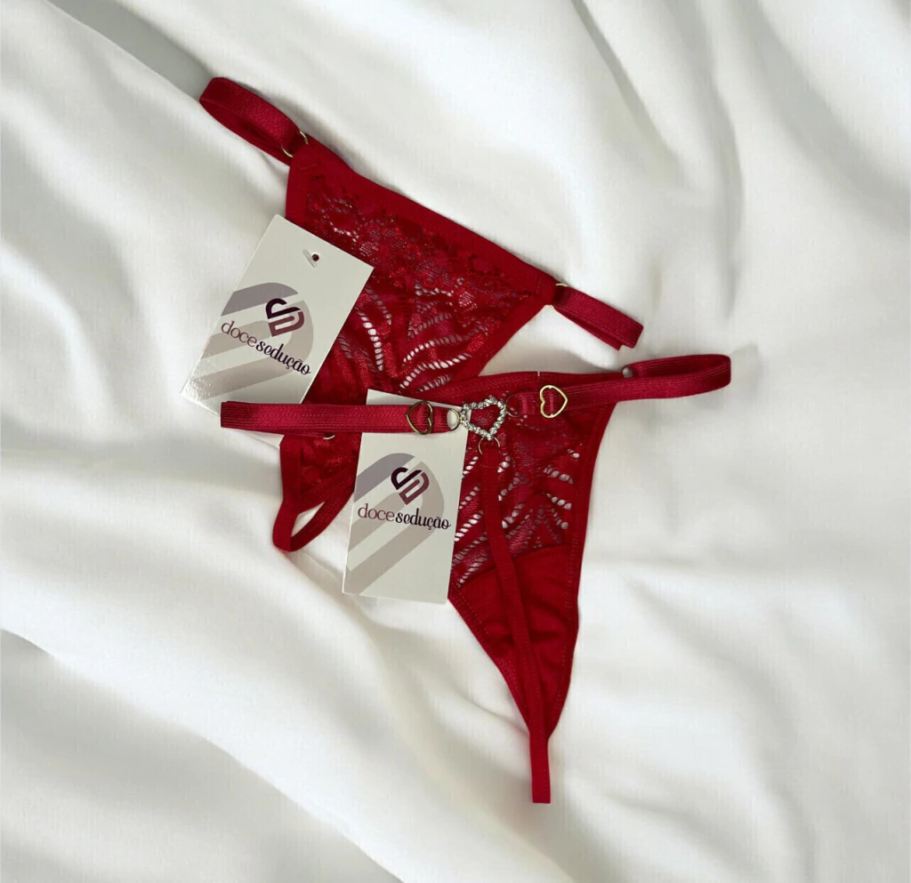 Tanga fio confeccionada em renda, alça de regulagem de coração em metal dourado, fundinho forrado em algodão e pingente dourado de coração cravejado em pedras atrás.