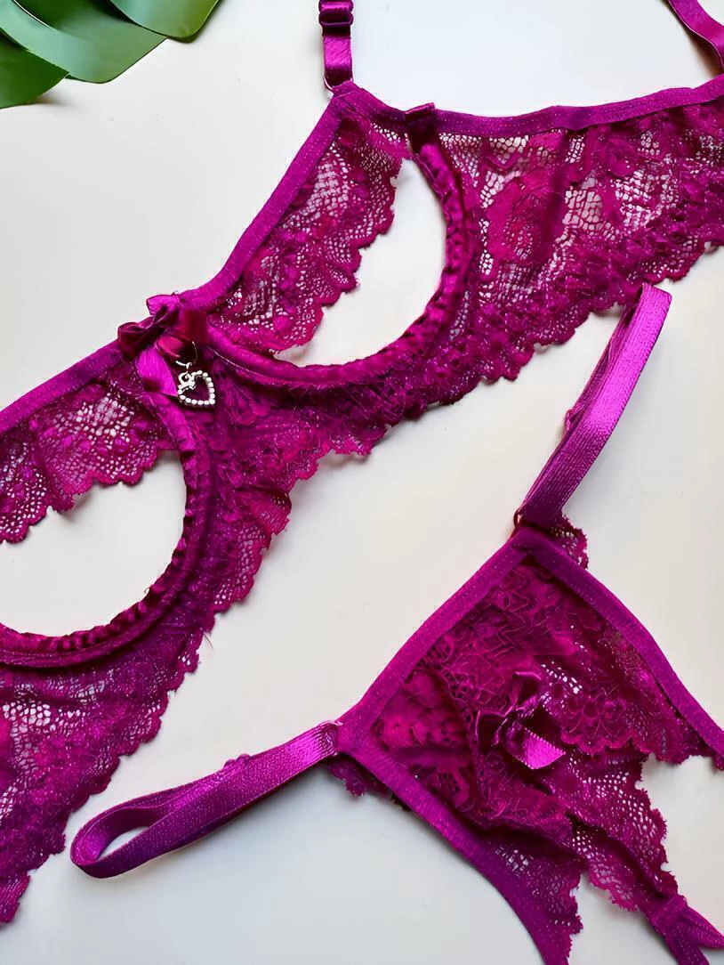 Conjunto confeccionado em renda, sutiã de aro aberto no seio, pingente de acrílico, alça de regulagem, colchete duplo, tanga fio de regulagem com abertura frontal.