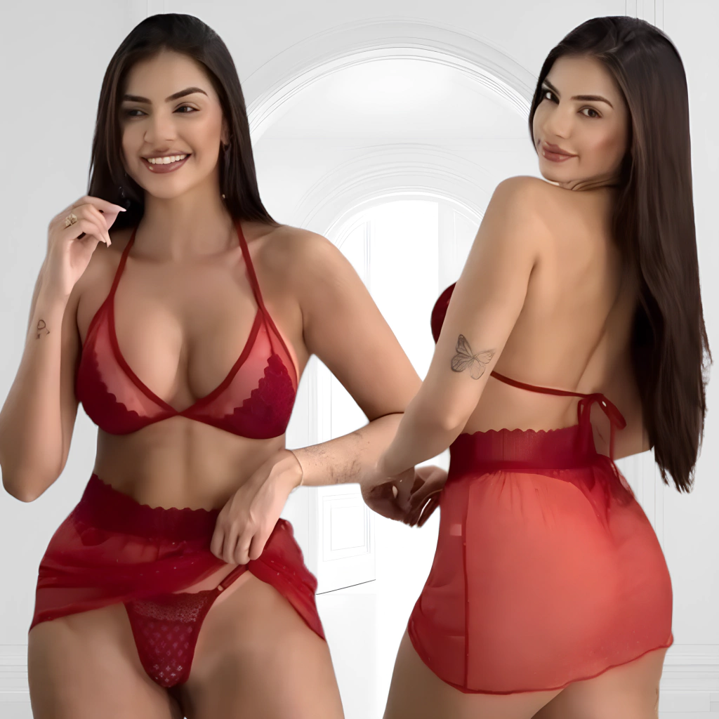 Conjunto confeccionado em tule poá e renda, alças para amarração, tanga fio de regulagem.