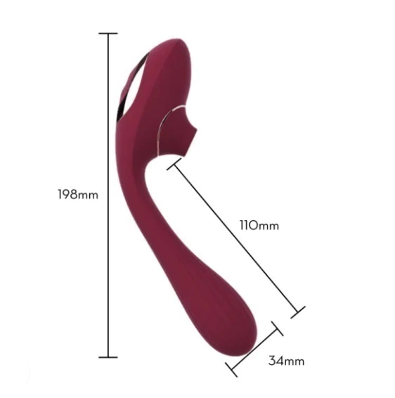 Estimulador clitoriano duplo, sendo: Um estimulador clitoriano por sucção e em sua outra extremidade um vibrador ponto G. Possui toque suave, aveludado e detalhes metalizados.
